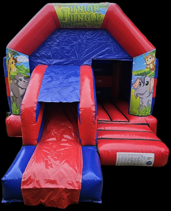 Swing into adventure with our Jungle Junior Red and Blue Front Slide Combi Bouncy Castle—perfect for pint-sized party animals!